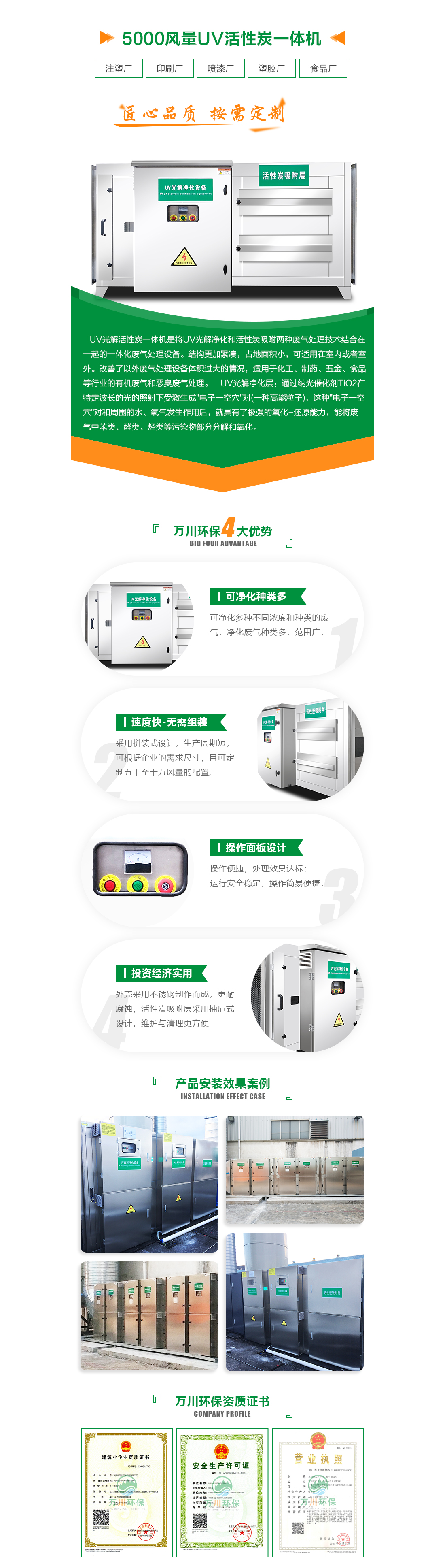 簡介:UV光解活性炭一體機是將UV光解凈化和活性炭吸附兩種廢氣處理技術結合在一起的一體化廢氣處理設備。結構更加緊湊,占地面積小,可適用在室內或者室外。改善了以外廢氣處理設備體積過大的情況,適用于化工、制藥、五金、食品等行業的有機廢氣和惡臭廢氣處理。