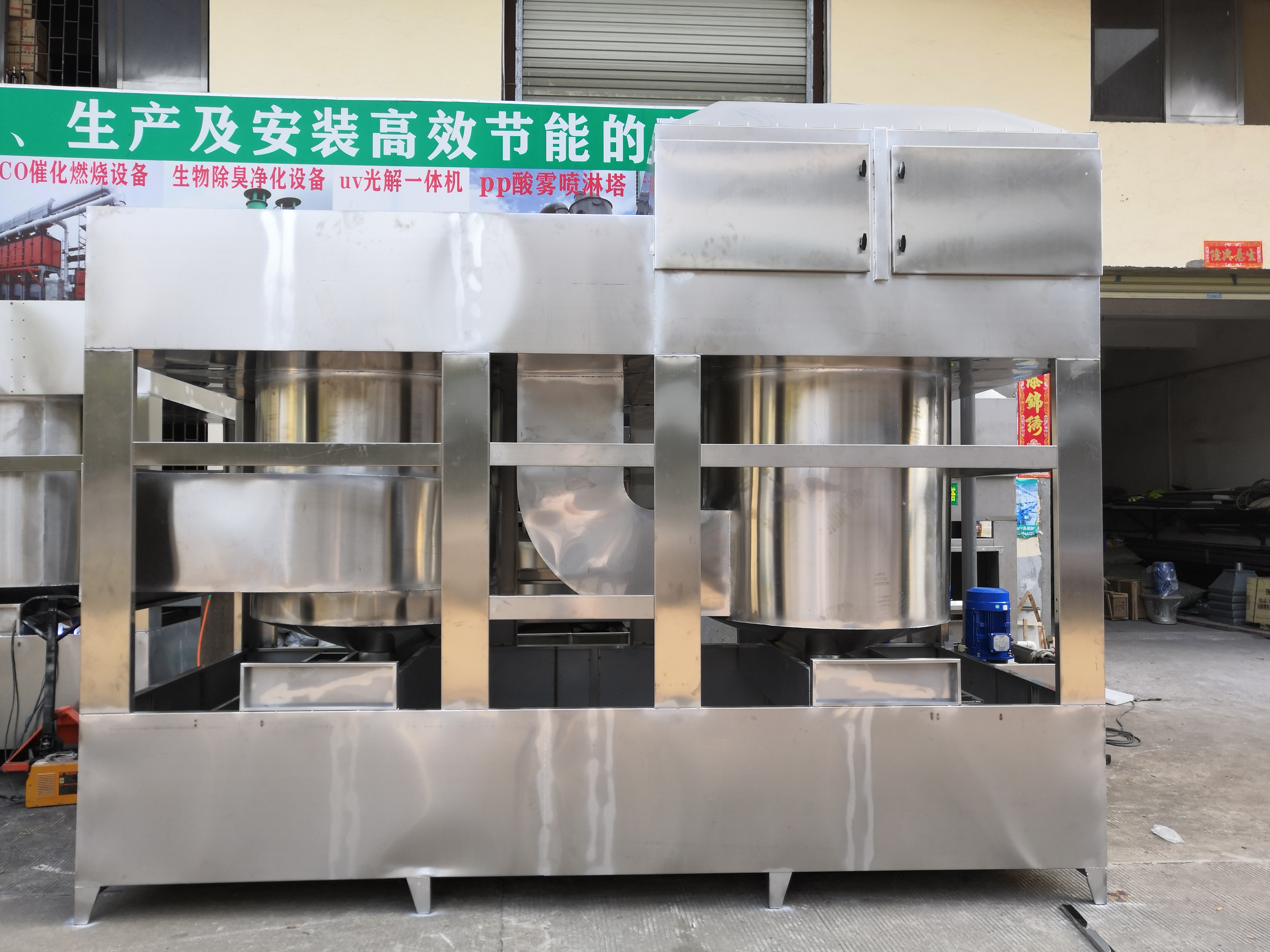 含塵含味氣體通過吸氣罩收集,在風機的作用下,經過管道輸送負壓進入雙級氣旋噴淋塔。氣旋混流裝置快速運轉,多級連續的凈化使得含塵含味氣體與水霧充份混合,在離心的作用下達到氣液分離。氣旋桶內部采用水泵循環給水,水在水箱經水泵增壓后自螺旋噴嘴霧化而出,最后回流至水箱循環使用。分離出來的雜物下沉到水箱底部,經凈化后的氣體進入填料隔水層,然后由風機排出。
