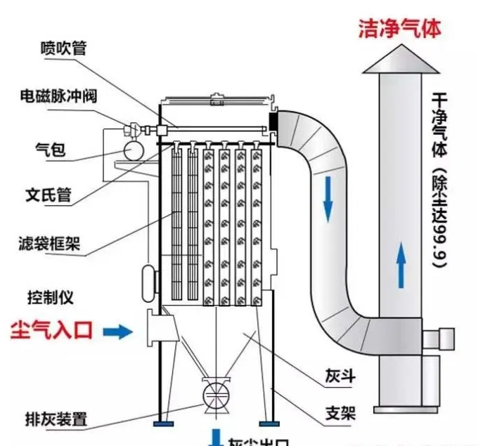 通過(guò)分離鐵筒集塵,二次濾袋集少量粉塵。三次濾筒過(guò)濾排放清潔空氣。