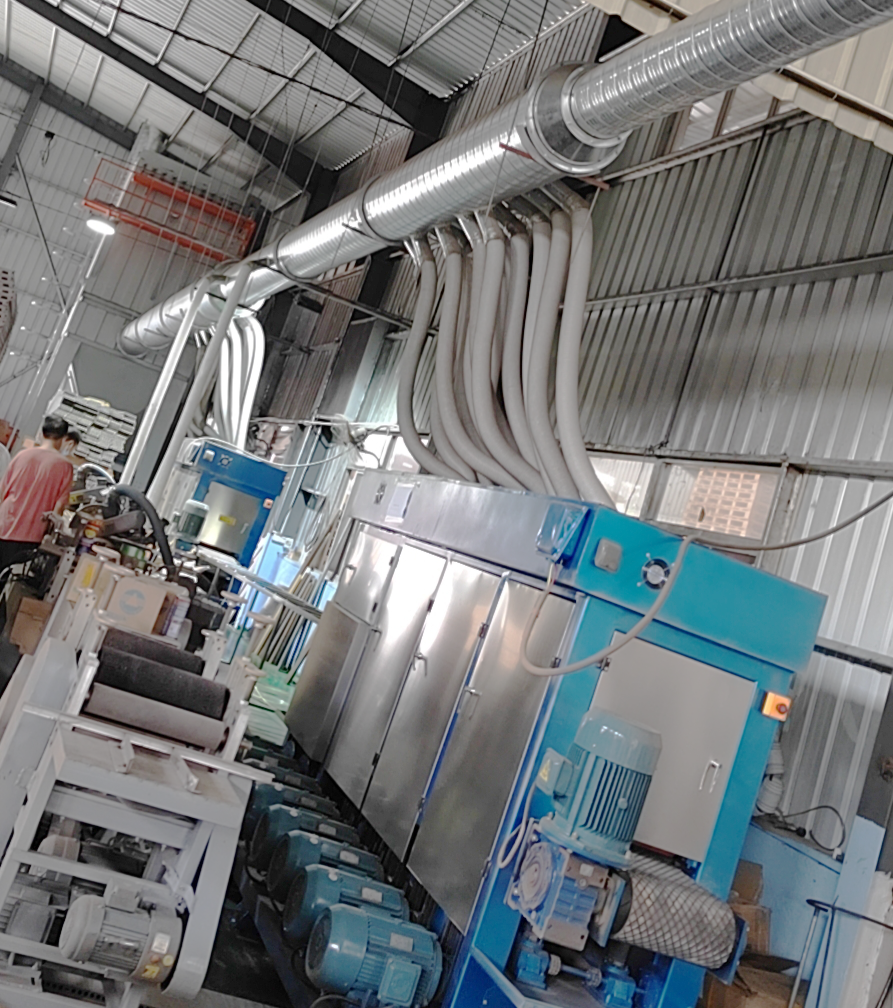 在木塑板生產(chǎn)的過(guò)程是要對(duì)其表面砂光、打磨處理,會(huì)產(chǎn)生大量的粉塵,萬(wàn)川根據(jù)場(chǎng)地與粉塵類(lèi)型設(shè)計(jì)了除塵方案與一配套木塑脈沖布袋除塵器。