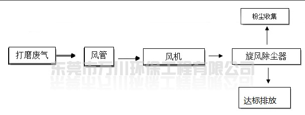 二樓的切削打磨屬于粉塵廢氣,打磨拋光時所產(chǎn)生的粉塵通過收集由引風機抽至車間外。本方案設計設粉塵廢氣處理系統(tǒng)二套,處理能力為15000m3/h,系統(tǒng)設于車間一樓。
