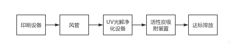 生產(chǎn)過程中產(chǎn)生的印刷廢氣通過風(fēng)機(jī)的作用下進(jìn)入風(fēng)管,首先廢氣會進(jìn)入UV光解凈化設(shè)備,然后印刷廢氣會進(jìn)入活性炭吸附裝置,最后達(dá)標(biāo)排放。