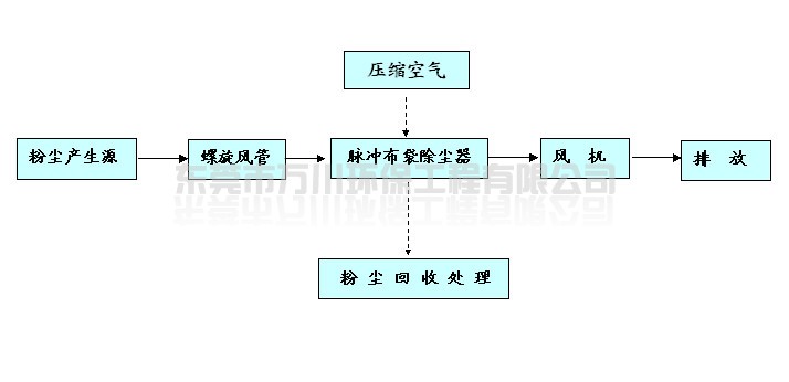 含塵廢氣在風機作用下,通過風管收集進入脈沖布袋除塵器,含塵廢氣進入中箱體下部,在擋風板形成預分離室內(nèi),粉塵因慣性作用落入灰斗。廢氣沿擋風板向上到達濾袋,粉塵被阻留在濾袋外面,干凈氣體進入袋內(nèi),并經(jīng)過袋口和上箱體及風機再排出。